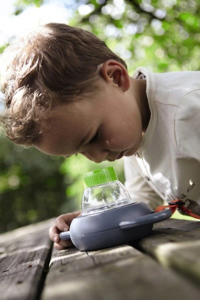 In die durchsichtige Beobachtungskammer wir ein Untersuchungsobjekt gelegt, vielleicht ein Blume, eine Spinne oder eine Feder. Der Deckel wird wieder verschlossen und nun kann die genaue Untersuchung beginnen: Die Lupe von oben vergrößert 6-fach und zeigt jedes Spinnenbein genau. Über ein raffiniertes Spiegelsystem kann aber auch von unten geschaut werden, durch das entsprechende Vergrößerungsglas an der Seite gibt es eine 4-fach-Vergrößerung. Die zwei großen Griffe an den Seiten erleichtern kleinen Kindern die Anwendung sehr.