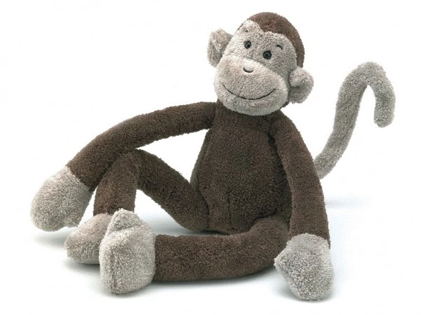 Ein freundlicher Affe mit schwarzen Knopfaugen der Londoner Firma Jellycat.