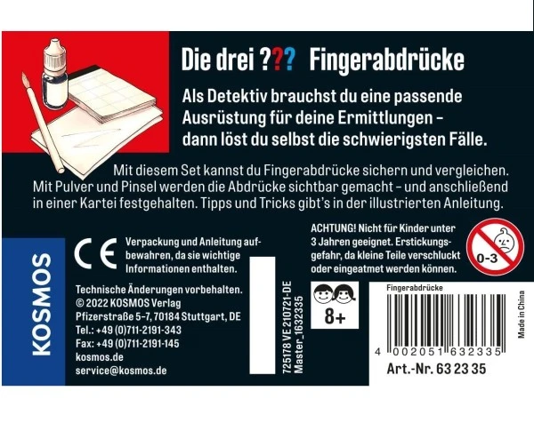 • Inhalt: Fingerabdruck-Pulver, Pinsel, transparente Klebefolien, Fingerabdruck-Block und eine farbig illustrierte Anleitung