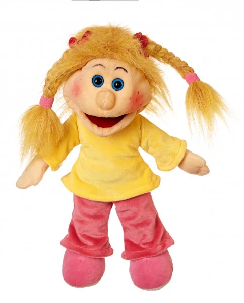 Die kleine Sandra ist ganz vernarrt in süße Sachen, keine Nascherei ist vor ihr sicher. Die kleine Naschkatze zaubert mit ihrer aufgeweckten Art Groß und Klein ein Lächeln aufs Gesicht. Die menschlichen Handpuppen von Living Puppets bringen Kinderaugen zum Leuchten und ermöglichen fantasievolles Spielen mit unendlich vielen Spielmöglichkeiten. Jede Puppe hat ihren ganz eigenen Charakter und besticht durch ihre Lebensfreude und den frechen Gesichtsausdruck. Sandra trägt rote Schuhe, eine rote Hose und ein gelbes Shirt. Das Shirt ist angenehm weich und lädt besonders zum Kuscheln ein. Ihre blonden Haare trägt Sandra zu zwei süßen geflochtenen Zöpfen, die von roten Haargummis gehalten werden.