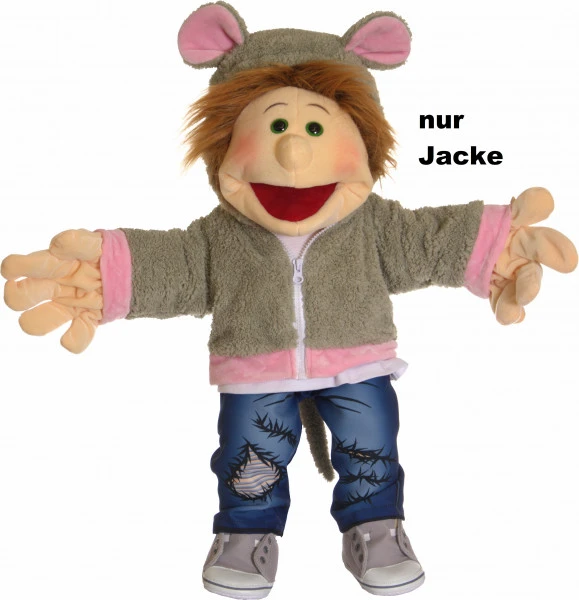 Hier haben wir eine plüschige Jacke, der als Kleidung für eine 65cm Handpuppe passt. der Clou ist die Kapuze mit niedlichen Mauseohren.
