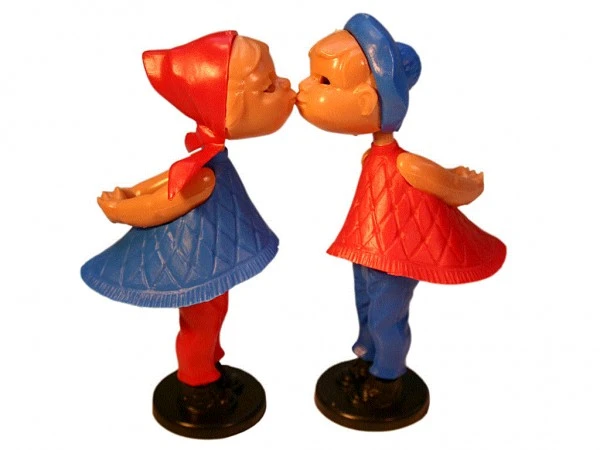 Die Puppen aus Kunststoff haben Gelenke in Hals und Hüfte, so dass sie leicht vor uns zurück wippen können. Die Magnete im Kopf bewirken, dass bei einer bestimmten Nähe die Anziehung so groß wird, dass beide – schwupps – in einem Kuss landen!