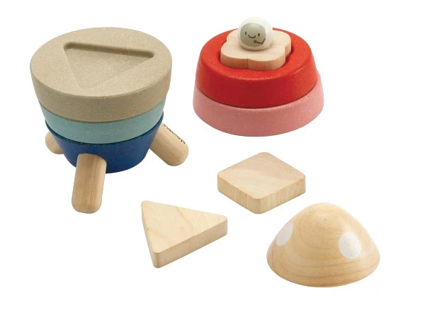 In der Stapelrakete von Plantoys finden sich einige Überraschungen. Geometrische Formen wie Dreieck und Quadrat können noch in die einzelnen Raketenescheiben gepuzzelt werden. Also ein Steck-Stapel-Sortierspiel!