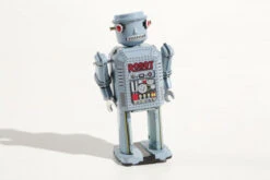Der Aufziehschlüssel wird unter dem Arm eingesetzt. Dann wandert der graue Roboter schwankend vorwärts.