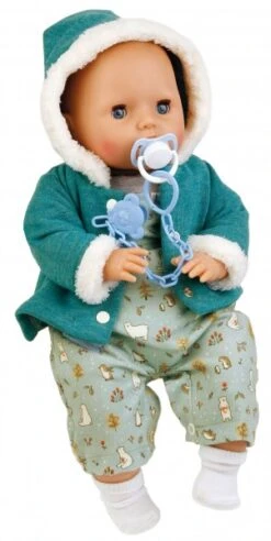 Durch ihr niedliches Gesicht ist die Schildkröt Puppe Amy Junge ein ganz besonderes Schnullerbaby – einfach zum dahinschmelzen! Mit ihrem weichen Stoffkörper und putzigen kleinen Baby-Klamotten lässt sich Amy super kuscheln und knuddeln. Aber auch umsorgen lässt sie sich gut, denn ohne ihren kleinen Schnuller und die beiliegende Windel wird die kleine Puppe natürlich schnell traurig. Ein tolles Extra: Amy hat blaue Schlafaugen, die sich beim Hinlegen schließen. So können die Kids mit dieser Puppe wundervoll realistische Rollenspiele spielen. Und wie immer bei der Traditionsfirma Schildkröt Puppen natürlich alles in einzigartiger Qualität. Ein echter Volltreffer für alle kleinen Puppen-Fans! • Schildkröt Puppe Amy Junge • Winterkleidung ausziehbar • Hergestellt in echter Handarbeit • Größe: Ca. 45 cm
