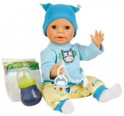 Trink- und Nässbaby Finn ist 40cm groß und trägt Shirt und Hose. Damit der Kopf schön warm bleibt eine Mütze.