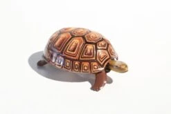 Schöne Blechspielzeug Schildköte mit braunem Panzer. Die Schildkröte wird auf der Unterseite mit dem beiliegenden Schlüssel aufgezogen und watschelt dann mit ihren 4 Füßen schön behäbig über den Tisch